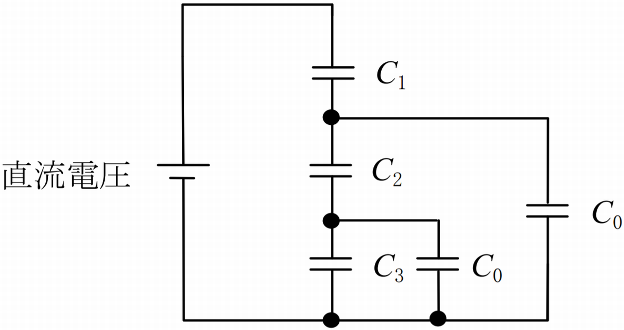 図に示すような、静電容量C1、C2、C3及びC0〔F〕の回路において、C1、C2及びC3に加わる電圧が定常状態で等しくなるときの条件式と して、正しいものを下の番号から選べ。