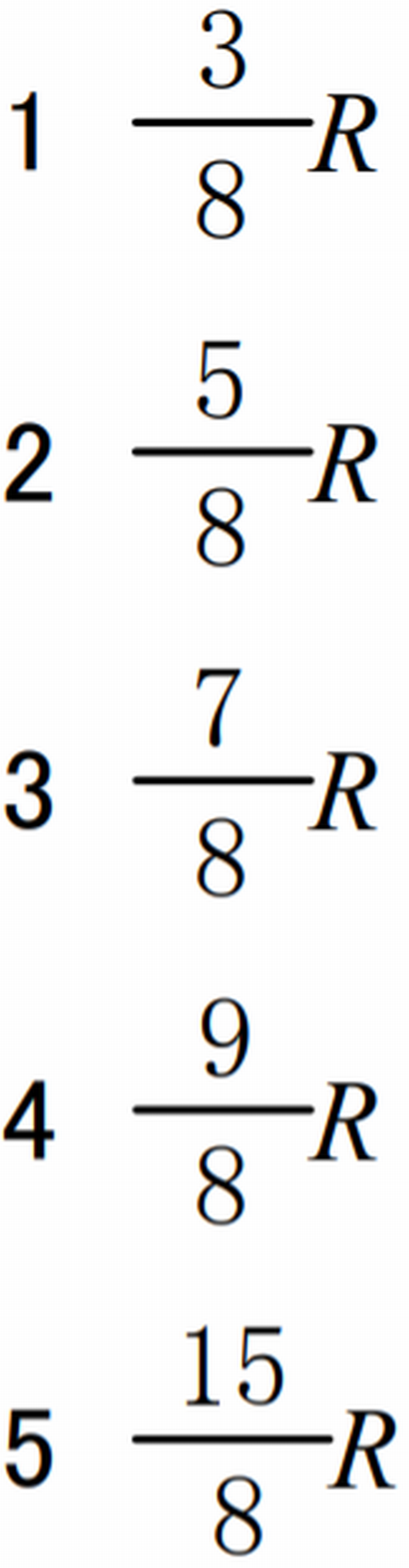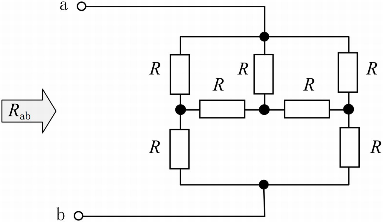 図に示すように、R〔Ω〕の抵抗が接続されている回路において、端子 ab 間から見た合成抵抗 Rab〔Ω〕を表す式として、正しいものを下 の番号から選べ。